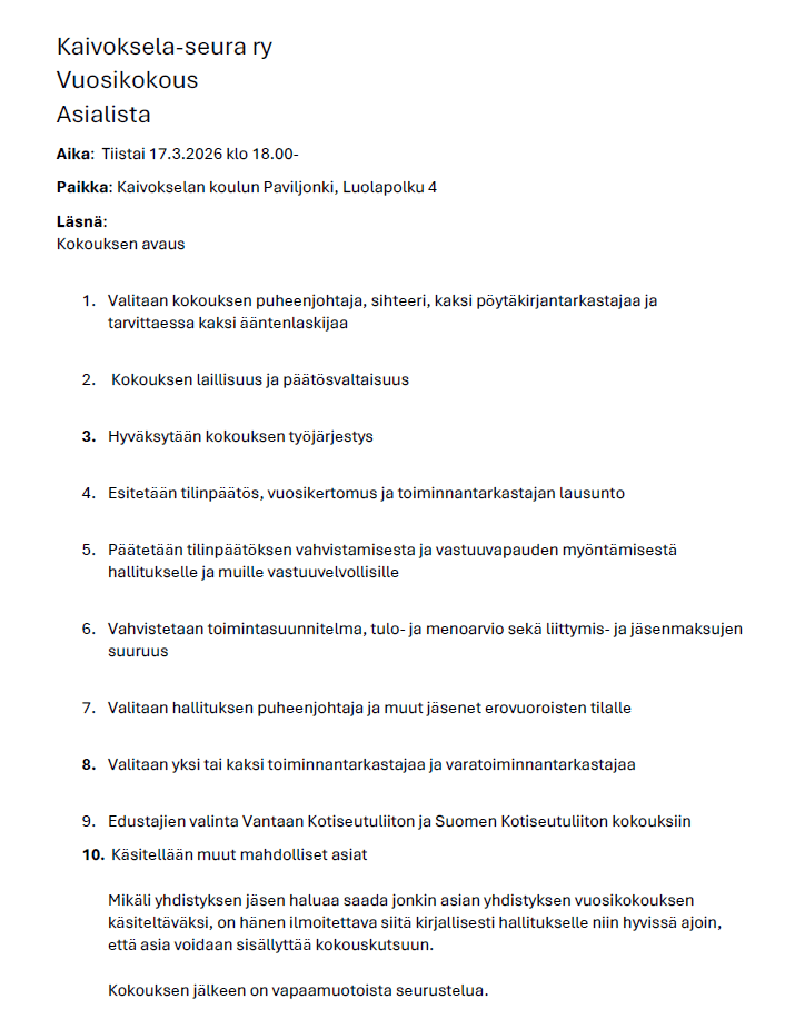 Kaivoksela-seura ry:n sääntömääräinen vuosikokous pidetään tiistaina 17.3.2026 klo 18.00 Kaivokselan koulun Paviljongin ruokalassa (osoite Luolapolku 4)